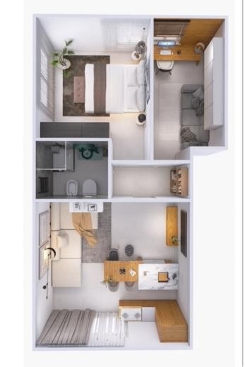 L'immobile, verrà consegnato completamente finito si trova al piano rialzato composto da ingresso, soggiorno con open space con cucina a vista, due camere e bagno finestrato.