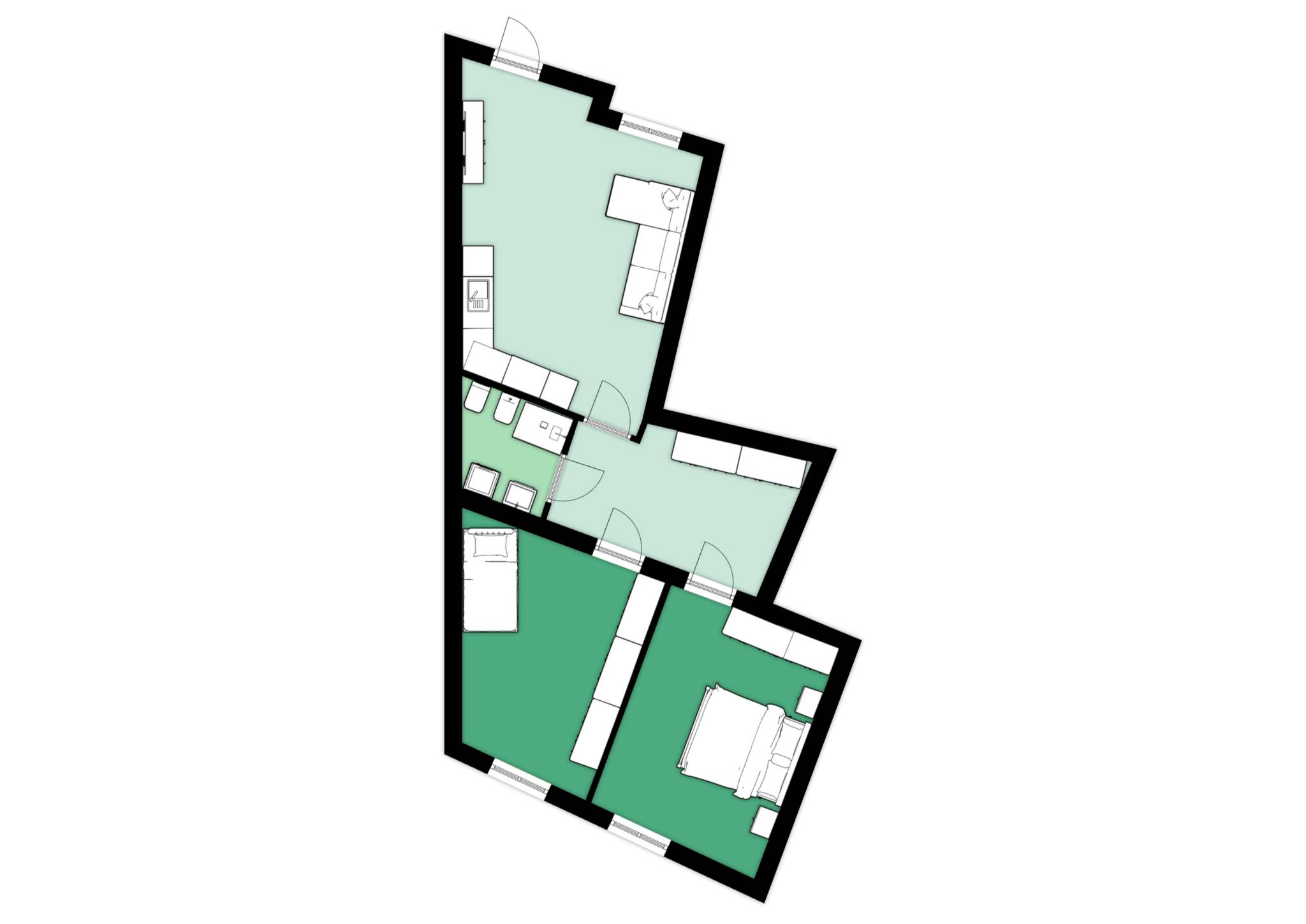 L'appartamento, posto al secondo piano, si compone di luminoso soggiorno con cucina a vista, due ampie camere da letto, bagno e pratico angolo studio. Dal soggiorno si gode di una suggestiva vista sulla città bassa.